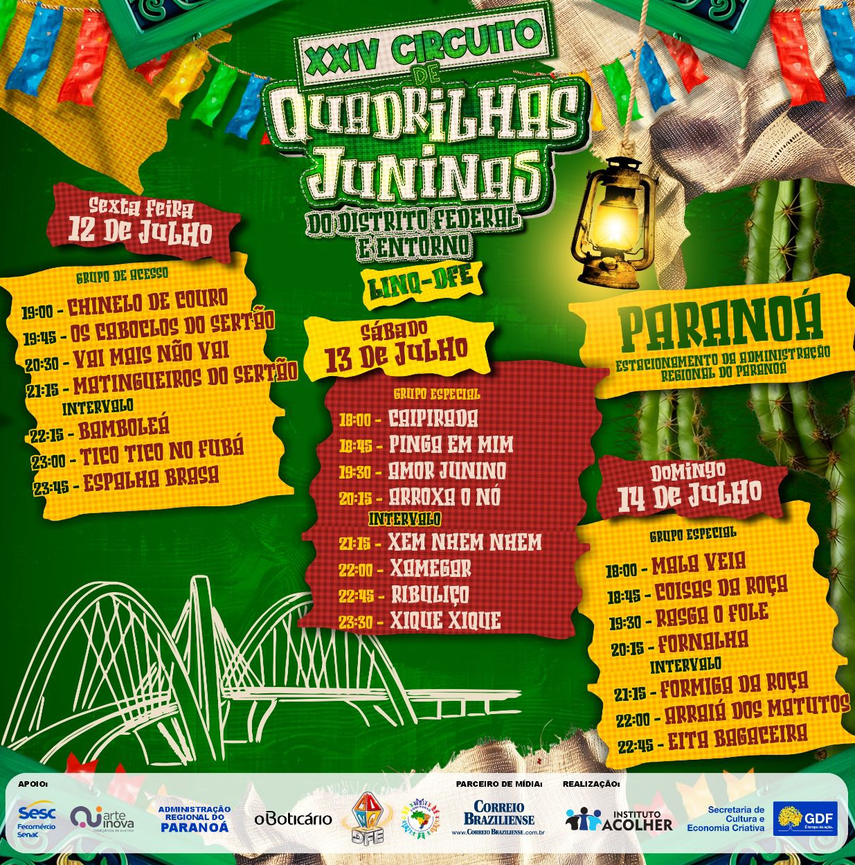 As apresentações das quadrilhas da LinqDFE já ocorrem neste final de semana, dias 11, 12 e 13 de julho, a partir das 18h30, no estacionamento da Administração Regional do Paranoá.