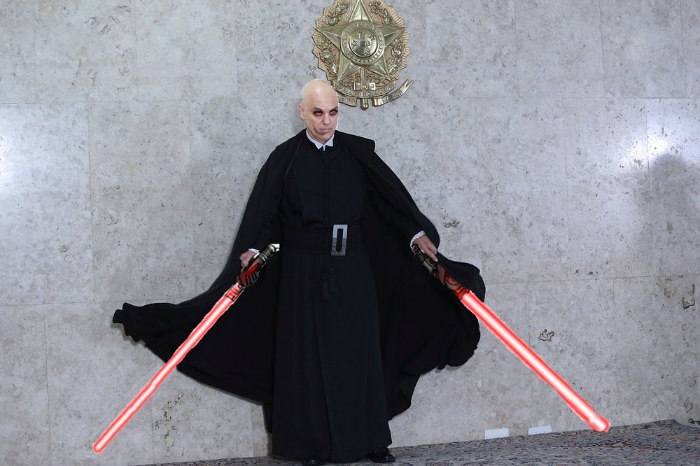 Na montagem, o ministro do STF aparece vestindo uma toga, segurando dois sabres de luz — em alusão a Star Wars — e com os olhos maquiados e maléficos.