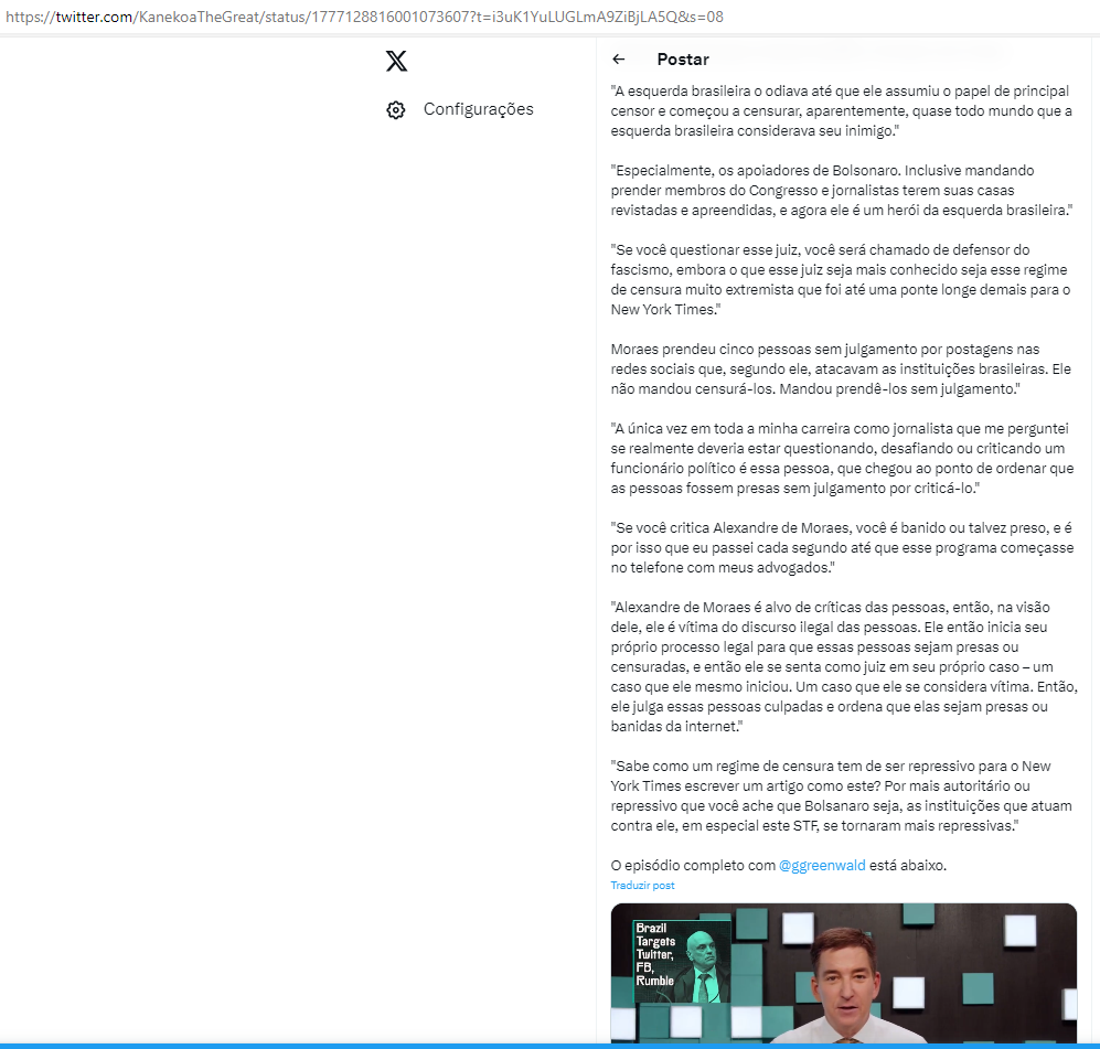 VEJA TAMBÉM: Glenn Greenwald desabafa sobre regime autoritário de censura de Alexandre de Moraes no Brasil citando o The New York Times