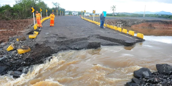 As equipes da Empresa Gaúcha de Rodovias (EGR) aguardam a água baixar para fazer o reparo e liberar novamente do trecho provisório na ERS 474, sobre Arroio Pereira, em Santo Antônio da Patrulha. Em virtude das fortes chuvas, o local encheu e a estrutura sofreu erosão em uma das bordas.