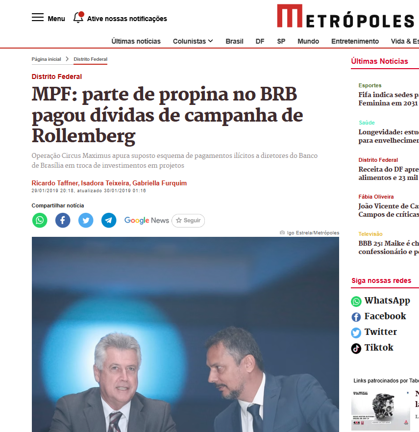 Na ocasião, em janeiro de 2019, uma das matérias veiculadas pelo Metrópoles sobre a operação Circus Maximus, dava conta de que à propina pagou divida de campanha de Rollemberg. Veja print do post abaixo: