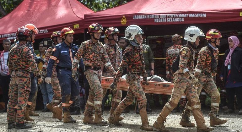 Bombeiros trabalham no resgate das vítimas do deslizamento na cidade de Batang Kali