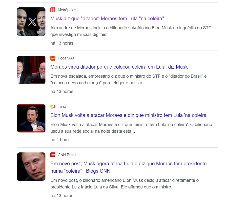 Segundo matéria do Metrópoles, bilionário Elon Musk subiu o tom na crise que criou com o Judiciário brasileiro e chamou Alexandre de Moraes, ministro do Supremo Tribunal Federal (STF), de “ditador brutal” na noite desta segunda-feira (8/4).