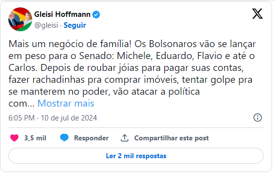 O post foi feito no X (antigo Twitter), no dia 10 de julho, quando Gleisi afirmou que Michelle e os filhos de Bolsonaro – senador Flávio Bolsonaro (PL-RJ), deputado federal Eduardo Bolsonaro (PL-SP) e vereador do Rio Carlos Bolsonaro (PL) – “vão se lançar em peso para o Senado”. “Mais um negócio de família!”, escreveu a presidente do PT. + Edinho Silva diz que quem precisa conduzir sucessão do PT é Gleisi Hoffmann