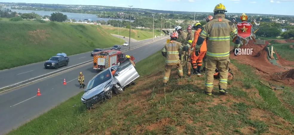 Um motorista de 26 anos perdeu o controle do carro e invadiu o canteiro da pista que dá acesso à ponte Costa e Silva, na Asa Sul, em Brasília. De acordo com o Corpo de Bombeiros, o acidente ocorreu após o condutor se envolver em um batida com outro veículo.