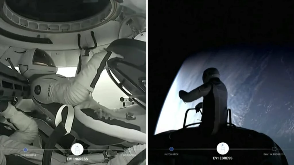 Após pouco mais de 40 minutos de preparativos finais, a escotilha da nave se abriu e dela saiu Isaacman, vestido com um dos trajes da empresa de Elon Musk que estão sendo testados nesta missão, na qual pela primeira vez um astronauta não pertencente a uma agência espacial governamental caminha pelo espaço.
