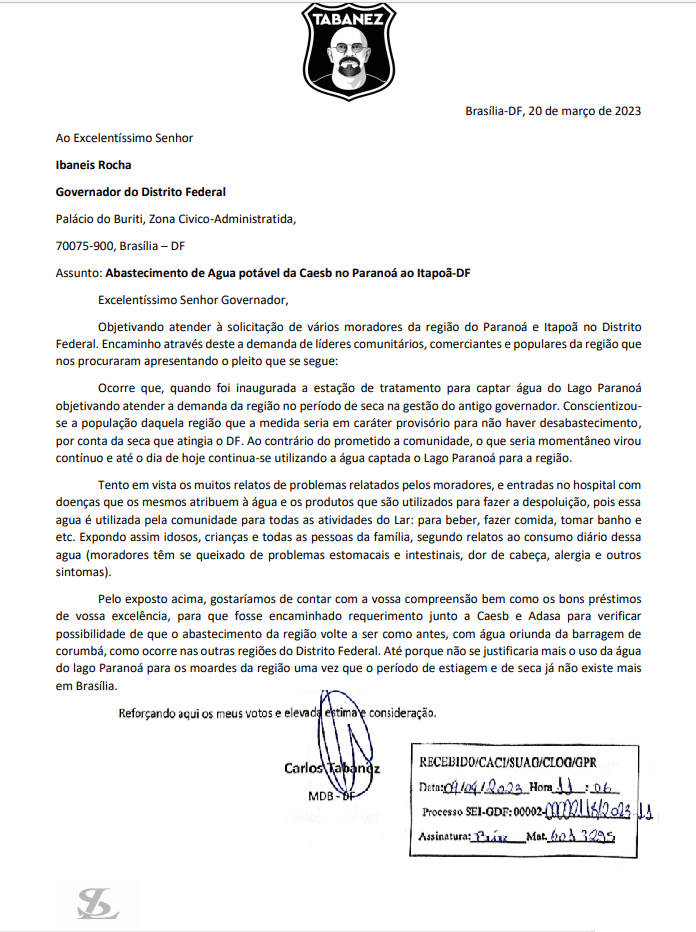 Diante desta situação, o ex-deputado distrital Carlos Tabanez (MDB), encaminhou requerimento via oficio ao governador do Distrito Federal, Ibaneis Rocha (MDB), para que o abastecimento volte a ser como antes. Ou via Barragem do Descoberto ou com água oriunda da barragem de Corumbá. Ou seja, objetivando que os moradores dessa região, principalmente Itapoã e Paranoá, não bebam mais das águas captadas do Lago Paranoá.