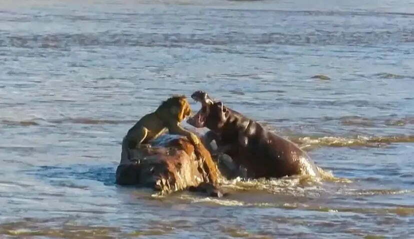 Um dia é da caça, outro do caçador: hipopótamos atacam leão preso em rocha no meio de um rio