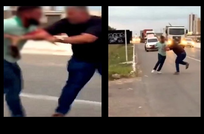 A cena foi inteiramente gravada por outros motoristas que pararam para acompanhar o conflito. As imagens são fortes. Na gravação, é possível ver um dos motoristas com a camiseta ensanguentada na altura do abdômen.