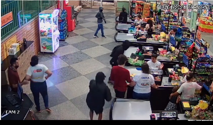 Armados e violentos, um grupo de bandidos fez um arrastão dentro de um mercado no Gama, por volta das 19h58 desta quarta-feira (17/4). Câmeras de segurança flagram toda a ação criminosa.