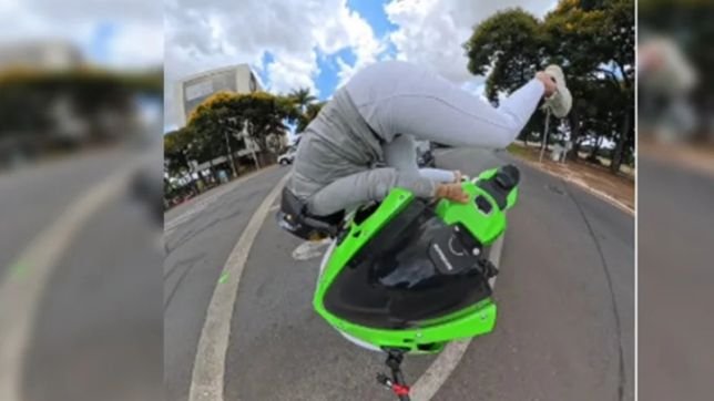 Uma câmera instalada em uma motocicleta flagrou o instante em que uma motociclista foi violentamente atingida por um carro que realizou uma manobra brusca, atravessando três faixas de rolamento, na tarde do último domingo (18). O acidente ocorreu no Eixo Monumental, em frente ao Tribunal de Justiça do Distrito Federal e dos Territórios (TJDFT), em Brasília. Com o impacto, a vítima foi arremessada e chegou a dar uma pirueta no ar.