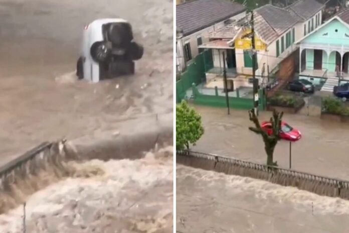 Chuva em Petrópolis: carros são engolidos e arrastados em enxurradas