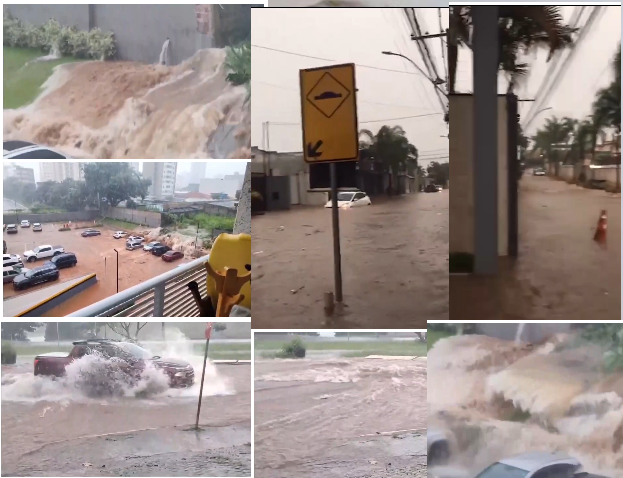 Águas e destroços invadiram o estacionamento de um condomínio na Rua Carnaúbas e danificaram carros parados no local. Apesar da violência da cena, não houve registro de pessoas feridas.