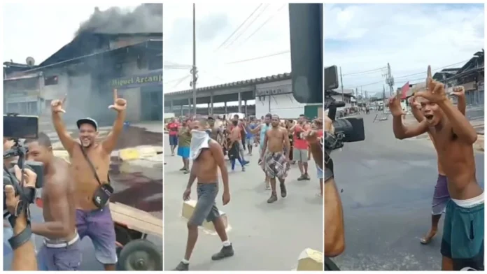 Centenas de homens, jovens e até crianças aparecem para saquear as mercadorias.